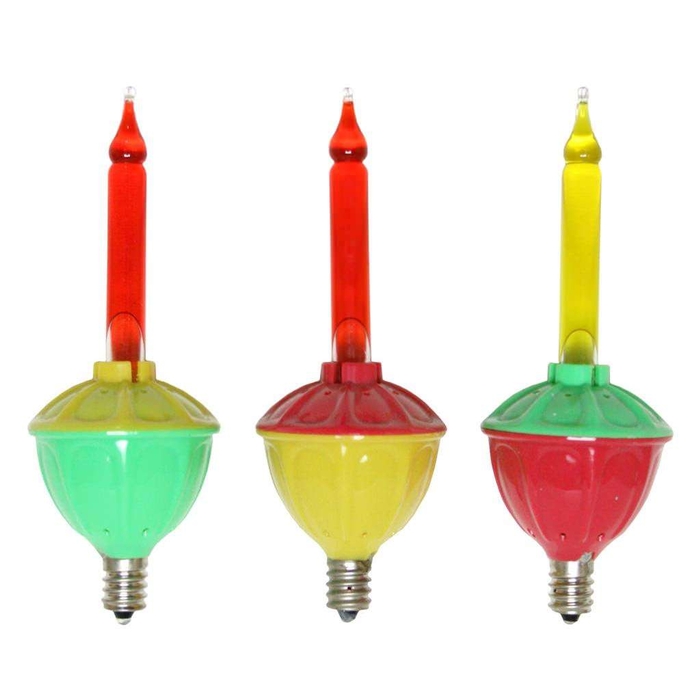 Noma was the king of Bubble Lights. However, Noma was sold to a company called Inliten 15-20 years ago and their Bubble Light line all but vanished. Today the Bubble Light torch has been picked up by several manufacturers such as Gerson, Roman, and GK and all product is UL. The most popular style is the 7 light traditional Bubble Light string made by Gerson. With green and red bases the vials bubble in greens, reds, blues and ambers. The bulbs are spaced 18” apart and if one bulb burns out or comes out of the socket, the rest stay lit. I have discovered one feature that is not mentioned on any of the packaging I have seen. Occasionally, the lights do not bubble even though they are lit. The solution is simple. Tap the base of the light softly with a ruler or knife. If that does not activate the fluid, simply unscrew the light, tip it upside down and shake it. This will activate the bubbling action virtually every time.